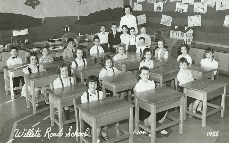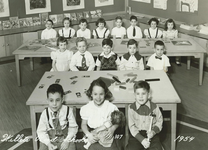 Writes Arthur -  “I recently found these two photos when cleaning up my parents’ personal effects.  Please ask if anyone knows who these people, including the teachers, are?  In the 1954 photo I am in the center of the second row, in the checkered sweater.  In the 1955 photo I am in the center in front of the teacher in the bow tie (the one on the left).  Many thanks, Arthur”