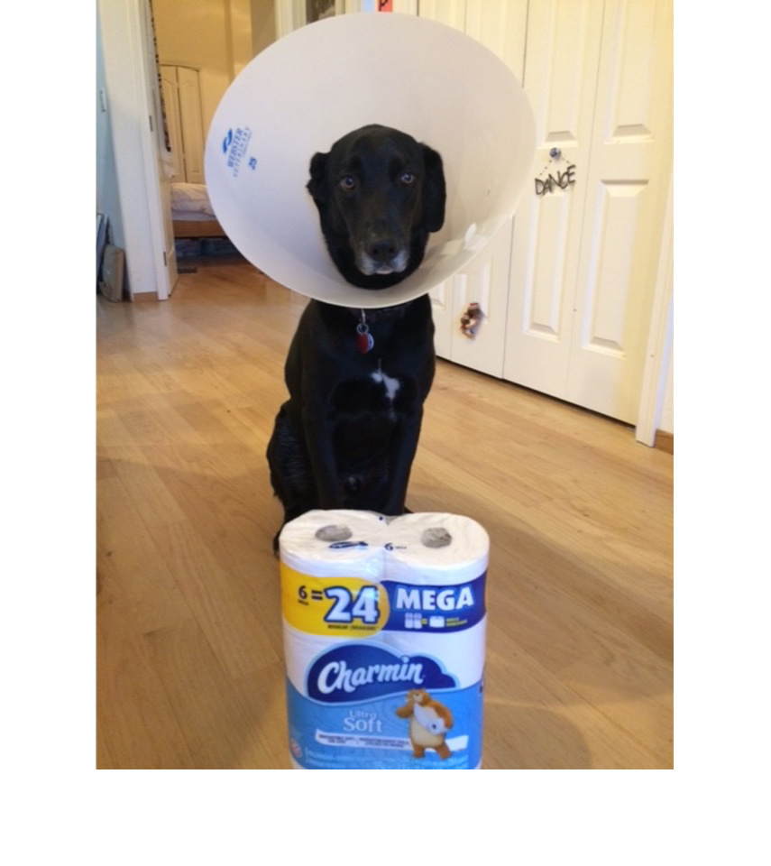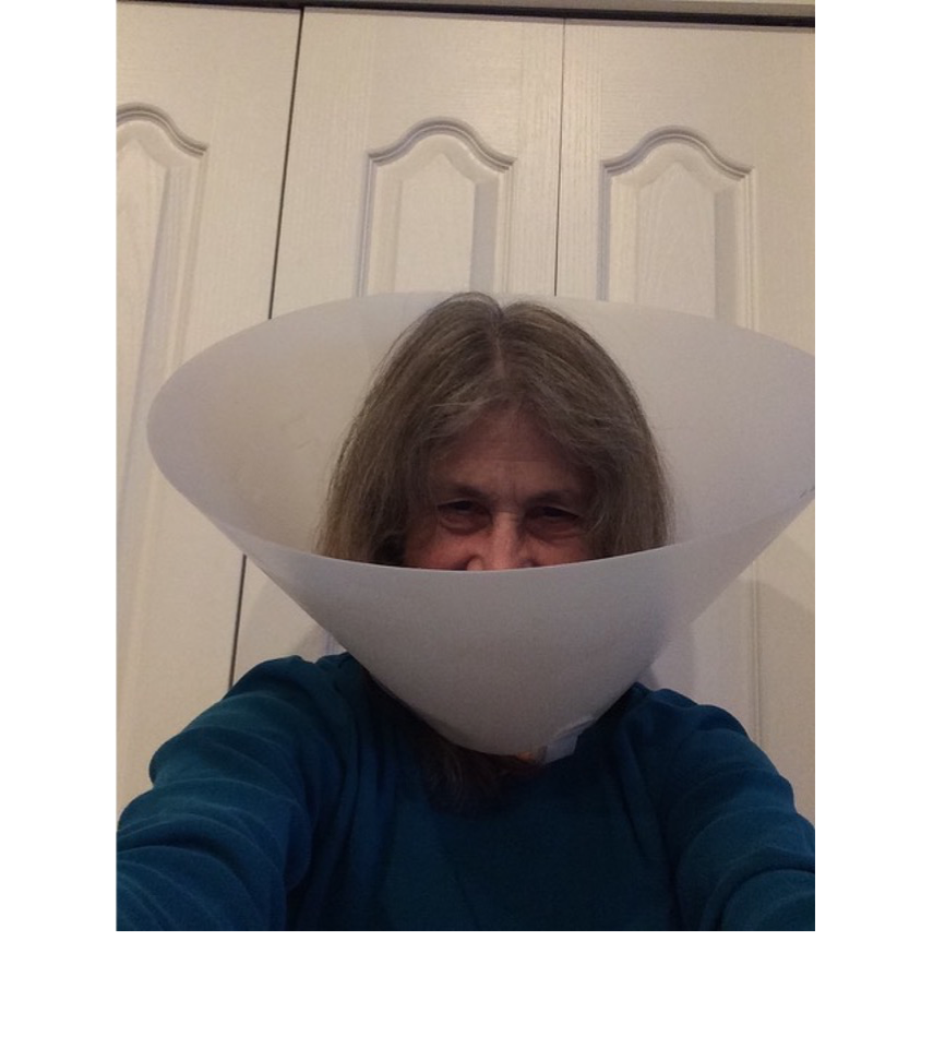 Writes Helene – “Hi All, Here’s my dog, Django, and myself practicing good hygiene; wearing a ‘cone of shame’ to keep our paws/hands away from our faces.  I’m using the time to finally read Moby Dick while drinking vodka quarantinis. I hope you are all doing well and managing to stay healthy and amused!   Helene”