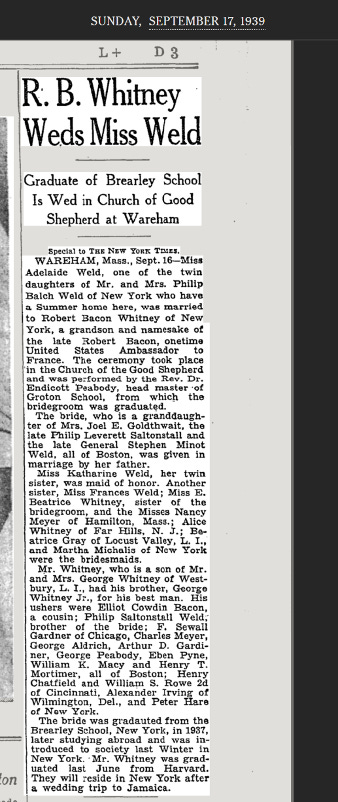 Adelaide W. Whitney was the wife of Robert Bacon Whitney; Martha Beatrix Whitney was his mother.  (Her father, Robert Bacon, had briefly been Secretary of State under Theodore Roosevelt).  RB Whitney died  in 1952, at the age of 36, while walking from the family home on Bacon Road to retrieve a car he had left at the East Williston train station. He was killed at 10 pm as he walked by the Wheatley Hills Golf Club on East Williston Avenue. The driver of the fatal car, the proprietor of a gas station in Glen Cove returning home from work, told police he could not see the pedestrian in the darkness.
