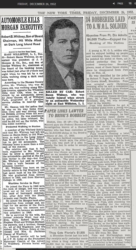 Writes Art Engoron (1967) - “The obituary has one absolute mistake and one ambiguity.  Robert Bacon Whitney was clearly walking west on East Williston, not “Hillside,” Avenue (of which it is an extension) when he was struck by a car that had turned westbound off of Glen Cove Road.