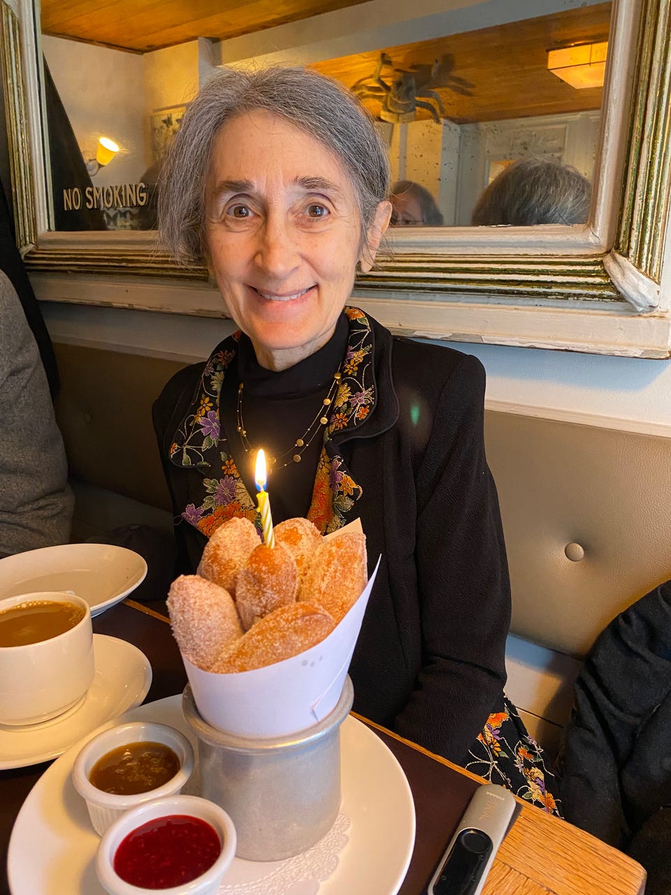 (2) - ready to blow out the candle on my birthday donuts at Cafe Cluny in the Village, where I had lunch with her; and