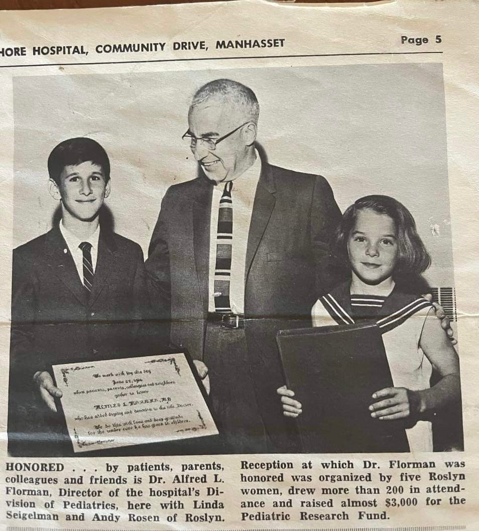 Writes Andrew Rosen (1971) - “Arthur: I read Rick Frishman’s (1972) comment with great interest.  When I was two years old my mother took me to Doctor Alfred Florman’s office.  He diagnosed me as having influenza.  Later in the day he decided to drop by my house.  He then decided that I had pneumonia as well and sent me to a hospital, where I spent two weeks in an oxygen tent.