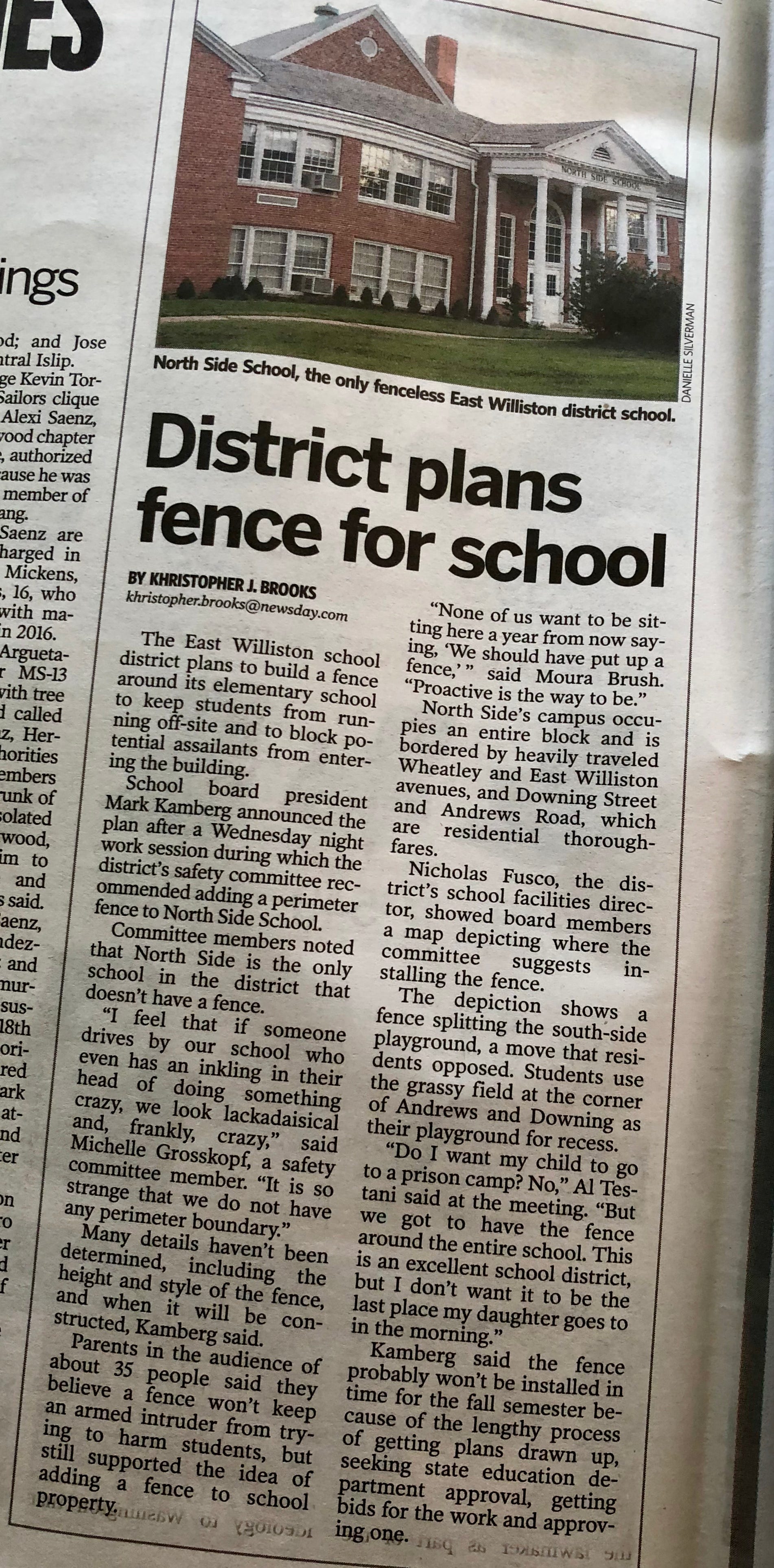 From 1954 to 1961, K-12, I attended the North Side School, and as recently as 10 years ago I took my three youngest children to play in the “new” playground. The building and grounds are a gem, an oasis of beauty and calm. A fence will destroy the gentle ambiance that is so conducive to learning. I still remember being in fourth grade, Ms. Hoffman’s class, looking out the window towards East Williston Avenue, and seeing placid green vegetation (I probably should have been paying closer attention to the lesson).