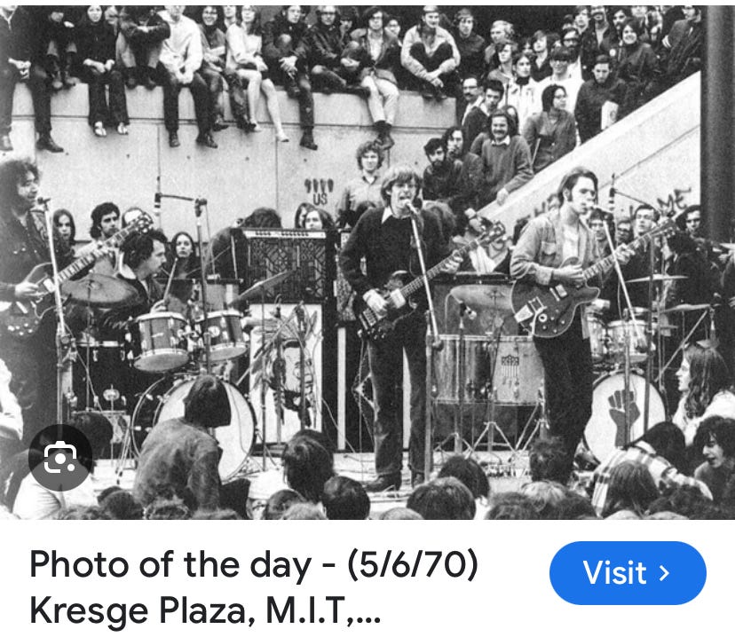 Continues Art Engoron - I believe that the three guys playing fretted instruments up front, with microphones, are, L-R, Jerry Garcia, Phil Lesh, and Bob Weir, and that the drummer on the left is Bill Kreutzmann (someone please correct me if I am wrong).