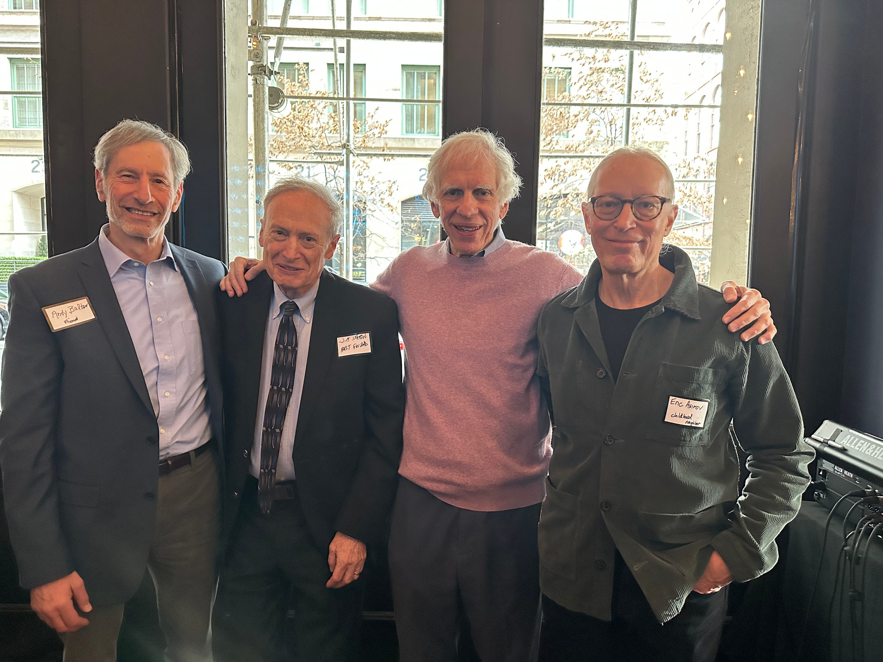 L-R - Andy Balter (1968), James Seaton (1967), Arthur Engoron (1967), Eric Asimov (1975) at Paisley, 429 Greenwich Street, New York, NY - December 7, 2024