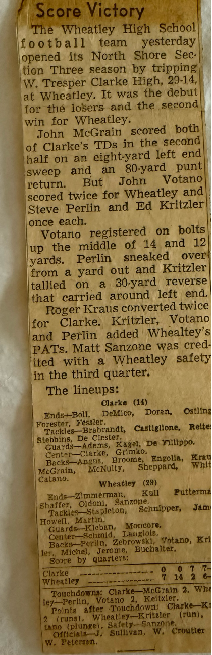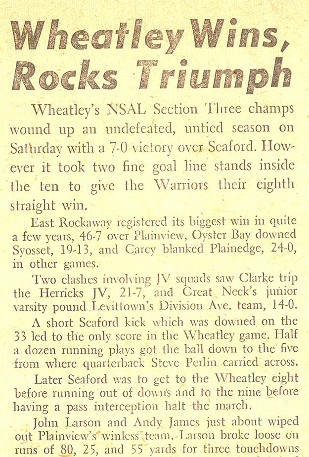 Long Island Press story about Wheatley’s 29-14 victory over W. Tresper Clarke High School.