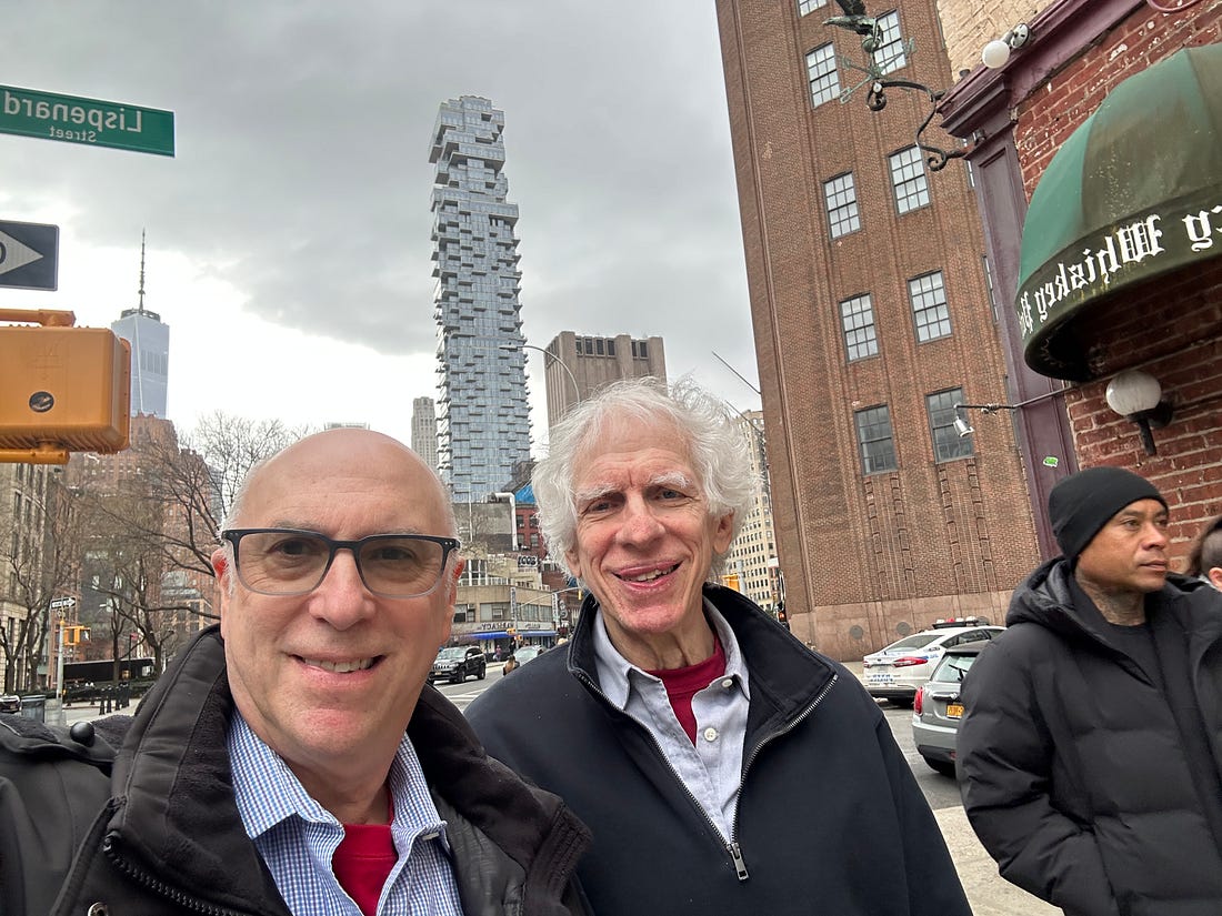 Todd Glickman and Art Engoron, outside Pepolino, with the Jenga Building, 56 Leonard Street, in the background.