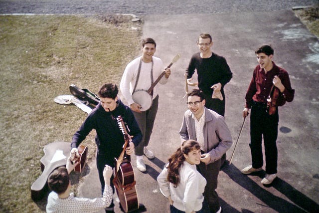 Corrected Caption - The guitarist in the black hoody with a pipe is David Berkowitz (1961). The guy in the gray jacket playing the harmonica is Peter Nelson (1961). The young guy on Mandolin is Josh Wilner (1965). The guy in the white pullover playing the banjo is Bob Kramer (1961). The guy in the black sweater playing the washtub bass is Richard Amster (1961). The guy in the reddish shirt with the fiddle is Peter F. Wolf (1960). The singer is Nancy Kurshan (1961).