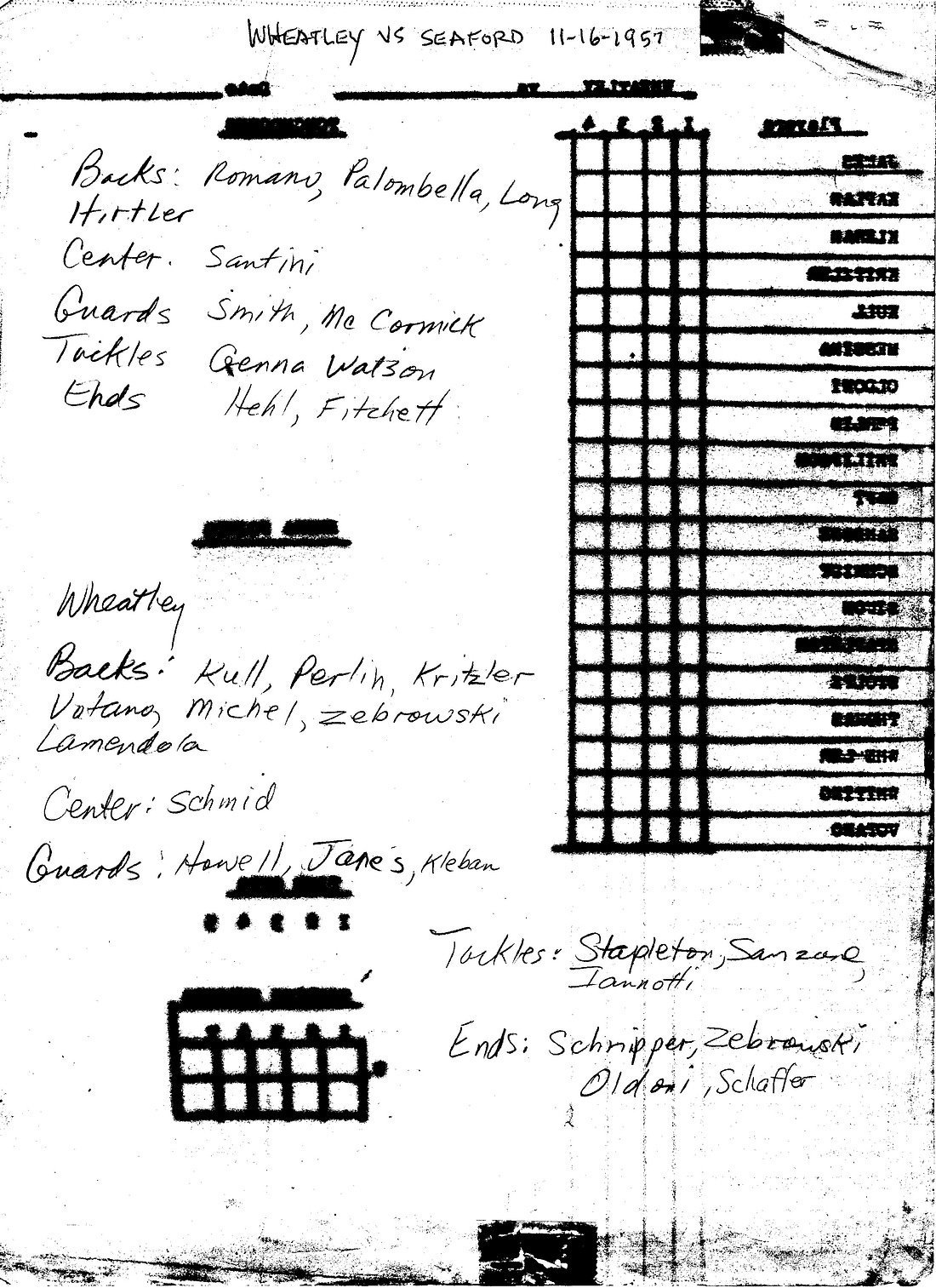 One of the game reporting sheets (Game#1) shows that Jeff was wearing uniform # 31. We also have scanned an official 1957 Wheatley Team Roster and determined that, although his name/data was crossed out, #31 was originally Jeff’s assigned jersey number. Interestingly enough, about the time Jeff disappears from the individual game reports, the # 31 jersey is being worn by sophomore Frank LaMendola, who didn’t play in Game#1 or Game #2, but is now suddenly playing throughout almost all of the last six games, and scoring points! Indeed, If you view the attached Seaford game program, # 31 LaMendola is specified as Full Back (FB) in the “Probable Starting Lineup.”