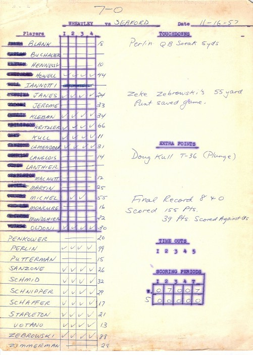 In response to Matt Sansone’s memory that Jeff Philipson was an offensive back for Wheatley’s football team in its Nov 1957 win over Seaford High School, I have come to the conclusion that Matt may have been thinking about someone else. I have scanned all eight of the official newspaper reporting forms I used to report key 1957 football game facts to the news media. These forms were designed by the coaching staff to assure that we could provide pertinent information to newsmen in the most efficient way.