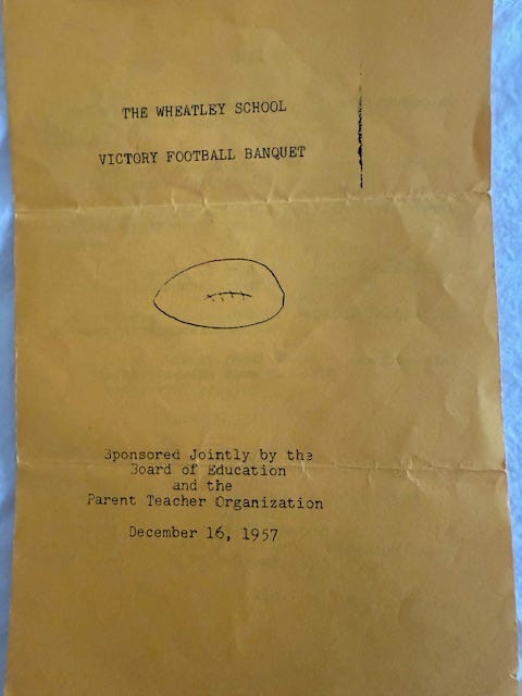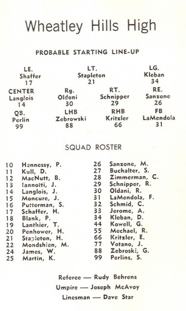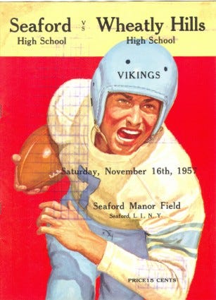 Bob Holley (1958) Writes - “Matt Sanzone's fine piece (‘Glory Days’) on the 1956-1957 Wheatley Wildcats football teams really hit home. What I remember best from the Seaford triumph was Zeke Zebrowski’s 50-60 yard punt that sealed the deal. I helped tear down the goalpost at game end and still have some splinters saved from that... The Seaford fans were pretty unhappy about everything-- thus the stones! Indeed, the Seaford clan must not have taken us very seriously, because their fancy game program named us incorrectly (see attached).
