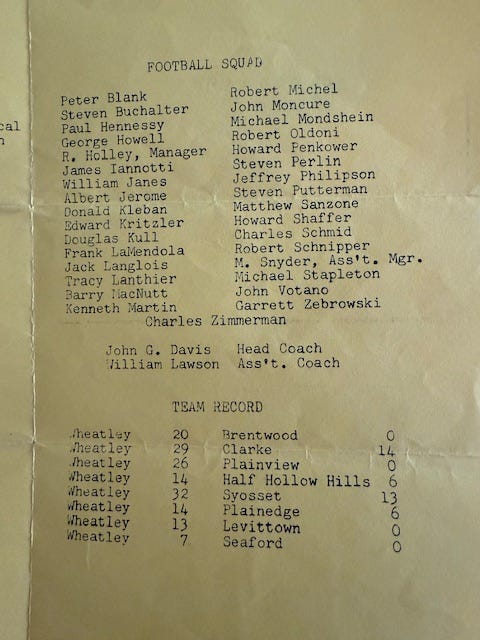 Paul Hennessy (1960) Writes - “Hola Amigos, Good job, Matt, of conveying the spirit and achievements of that storied ( & undefeated) band of brothers👍. Another key factor in the 7-0 win over Seaford was a booming punt 50 to 60 yards, by sophomore Garrett “Zeke” Zebrowski that pinned Seaford deep in their own territory late in the game. The Seaford program for the event named us ‘Wheatley Hills High.’ Maybe the author was familiar with the Wheatley Hills Golf Club just down the road from us.”