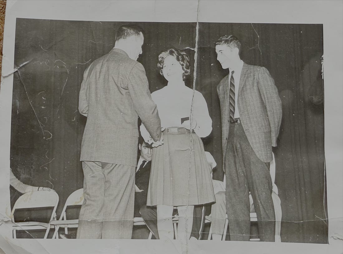 In May 1961, on the stage of the Wheatley Auditorium, Principal Norman Boyan awarded fencing medals to Carol Abby Benjamin (1963) and Peter Calderon (1961).