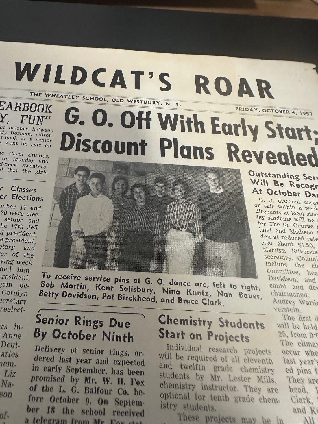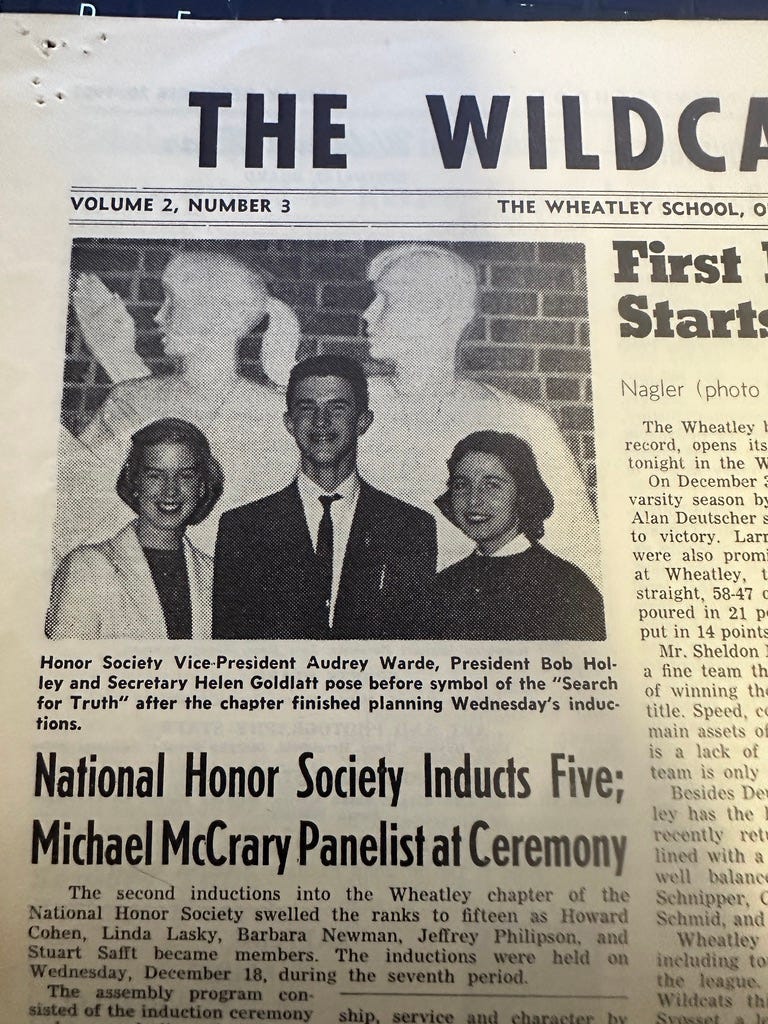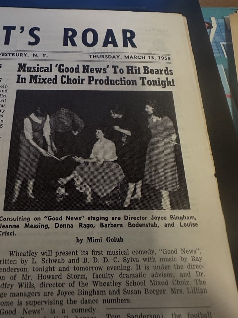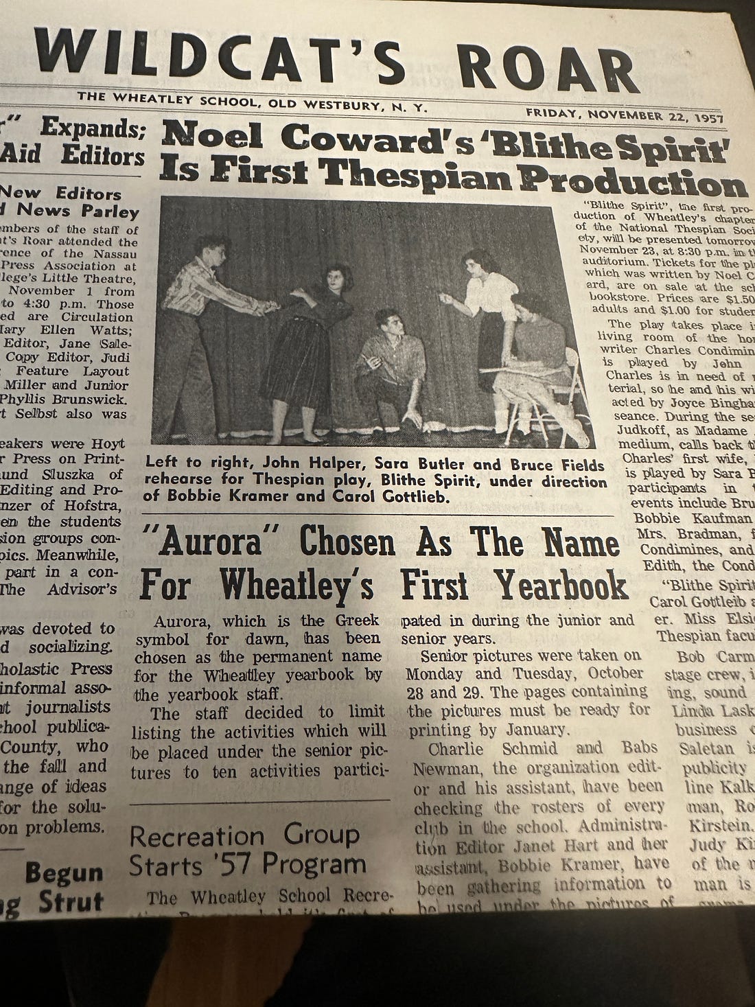 The November 22, 1957 Wildcat reported on preparations for a production of Noel Coward’s “Blithe Spirit,” with acting by John Halper (1958), Sara Butler (1958), and Bruce Fields (1959), under the direction of Barbara “Bobbie” Kramer (1958) and Carol Gottlieb (1959). Right below that article is one about “Aurora” (as in “dawn,” “new,” and “beginning,” like the school itself) being chosen as the name of Wheatley’s forthcoming yearbook(s).