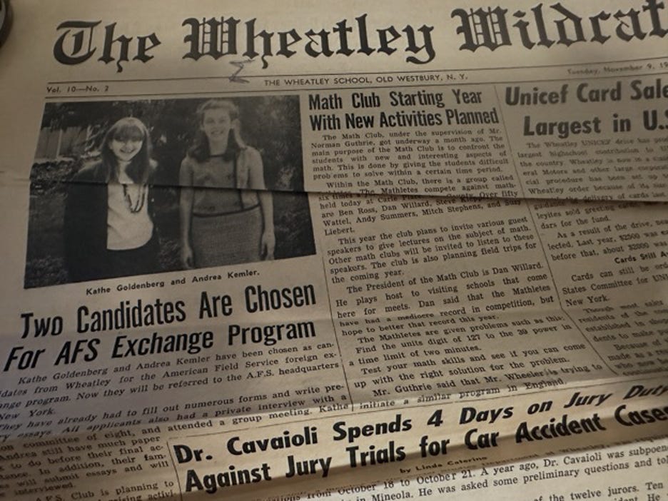 The November 9, 1965 Wildcate highlighted Andrea Kemler and Kathe Goldenberg (both 1967), who were selected as candidates to become AFS (American Field Service) foreign exchange students. Andrea spent an academic year in Japan, and Kathe spent an academic year in Italy.