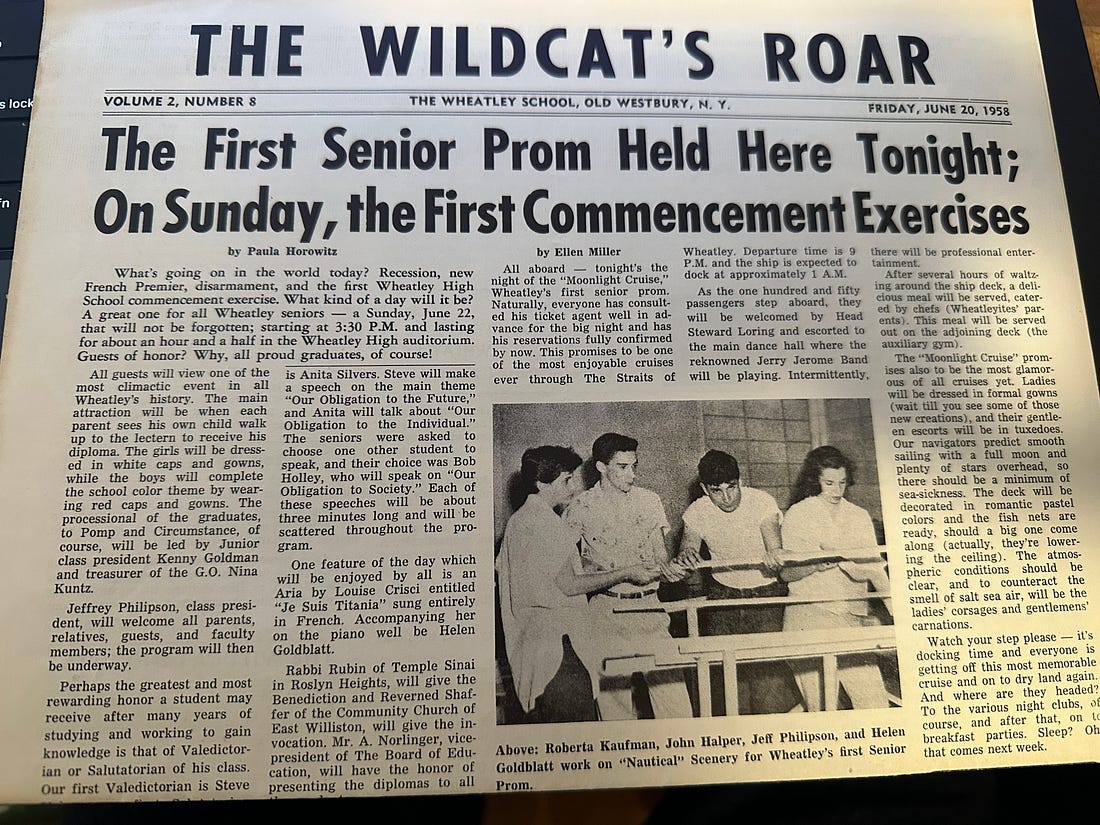 The June 10, 1958 Wildcat reported that Wheatley’s first senior prom, “Moonlight Cruise,” would be held that evening, with help from Roberta Kaufman (1958), John Halper (1958), Jeff Philipson (1958), and Helen Goldblatt (1958).