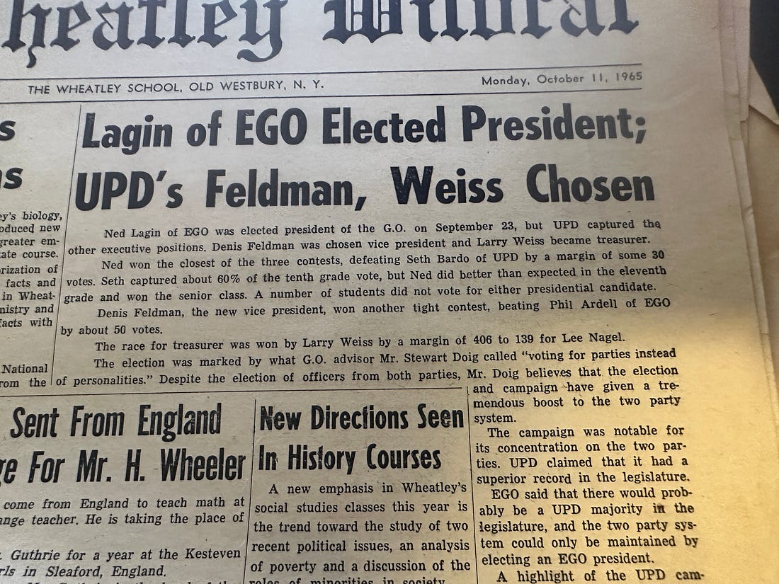In October 1965 Ned Lagin (1966) (who later played keyboards with the Grateful Dead) of the EGO (“Efficient General Organization”?) Party was elected President of the General Organization (i.e., student government). Denis Feldman and Larry Weiss of the UPD (“United Progressive Democrats”?) Party were elected Vice President and Treasurer, respectively.