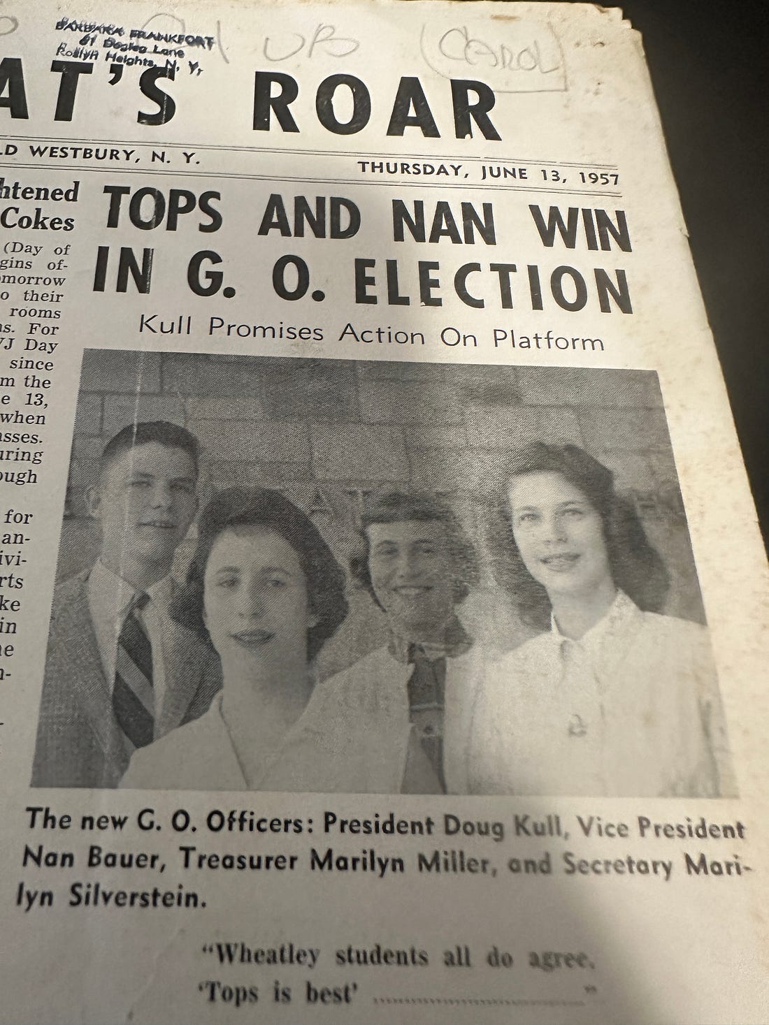 The June 13, 1957 Wildcat reported that the new G.O. (“General Organization”; the name of the student government) officers were President Doug Kull (1958), Vice President Nan Bauer (1959), Treasurer Marilyn Miller (1958), and Secretary Marilyn Silverstein (1960)