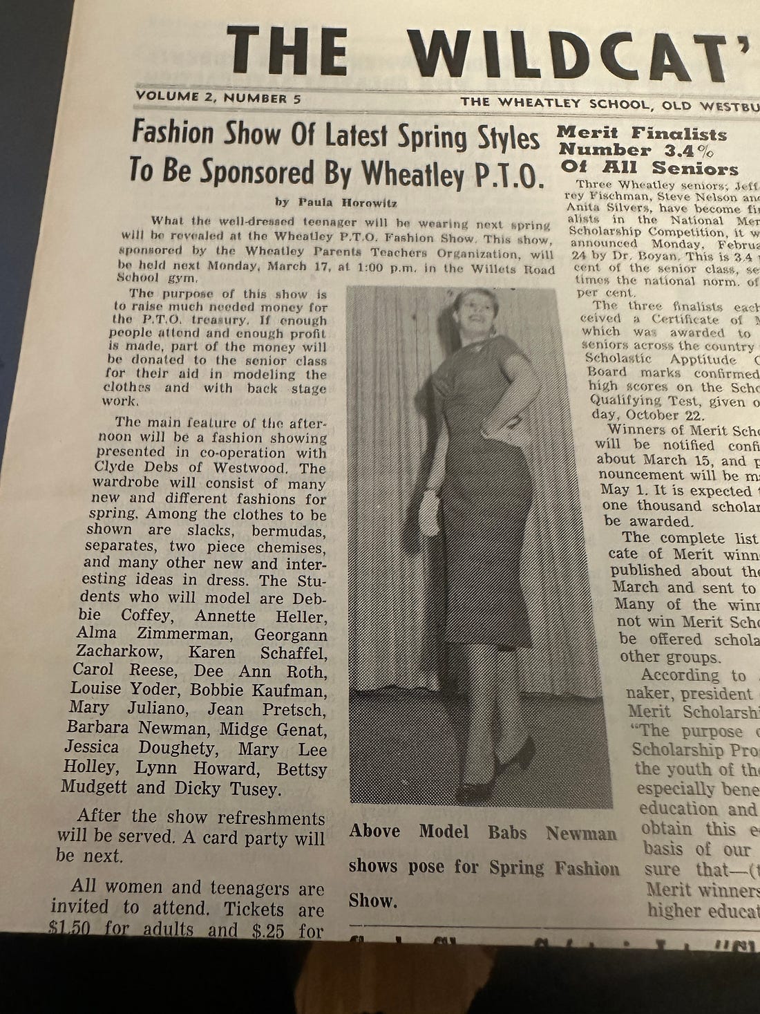 That same issue reported on a fashion show to be held in the Willets Road School Gym to raise money for the Wheatley Parent Teacher Organization. And what better way to garner interest than a photo of Barbara Newman (1958) wearing the latest style.