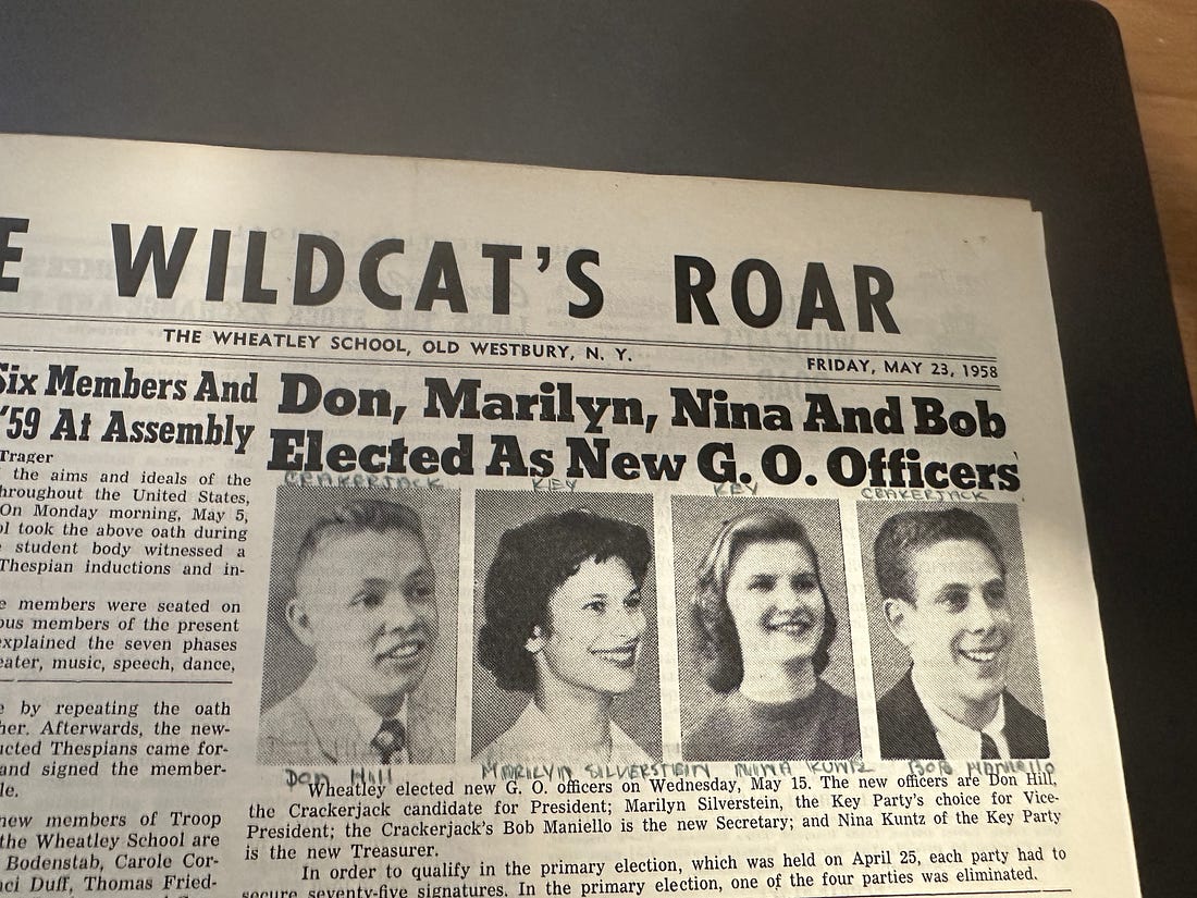 The May 23, 1958 Wildcat reported on the election of new G.O. officers: President Don Hill (1959), Vice President Marilyn Silverstein (1960), Treasurer Nina Kuntz (1959), and Secretary Bob Manniello (1961). They represented two political parties, “Crackerjack” and “Key Party.” "Plus ça change, plus c'est la même chose" (pardon my French).