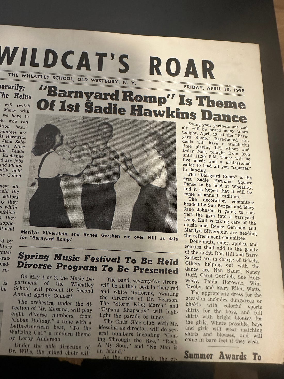 The April 18, 1958 Wildcat described Wheatley’s first “Sadie Hawkins Dance,” themed “Barnyard Romp.” Pictured are Marilyn Silverstein (1960) and Renee Gershen (1960) vying for the attention of Don Hill (1959).