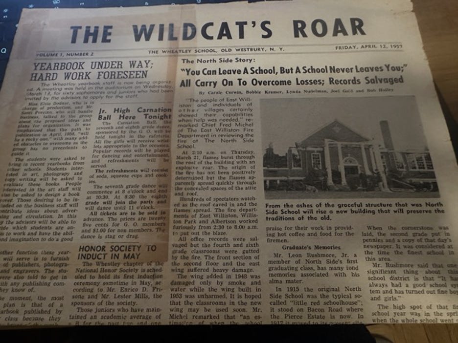 The April 12, 1957 (“Volume 1, Number 2”) issue of the Wildcat published “The North Side Story” about the March 21, 1957 fire at The North Side School. “You Can Leave a School, But a School Never Leaves You” noted the headline. East Williston Fire Department Chief Fred Michael declared, “The people of East Williston and individuals of other villages certainly showd their capabilities when help was needed.”