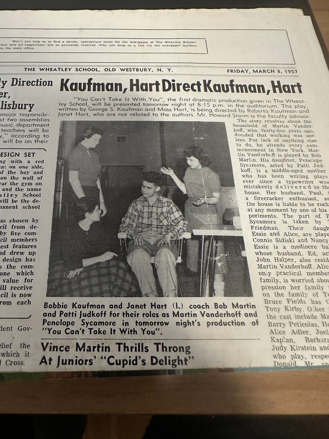 The March 8, 1957 (“Volume 1, Number 1”) Wildcat reported the amazing coincidence that Roberta Kaufman and Janet Hart (both 1958) were directing a production of “You Can’t Take it With You,” written by George Kaufman and Moss Hart. The Wildcat noted that the four of them were not related. As the headline proclaims “Kaufman, Hart Direct Kaufman, Hart.”