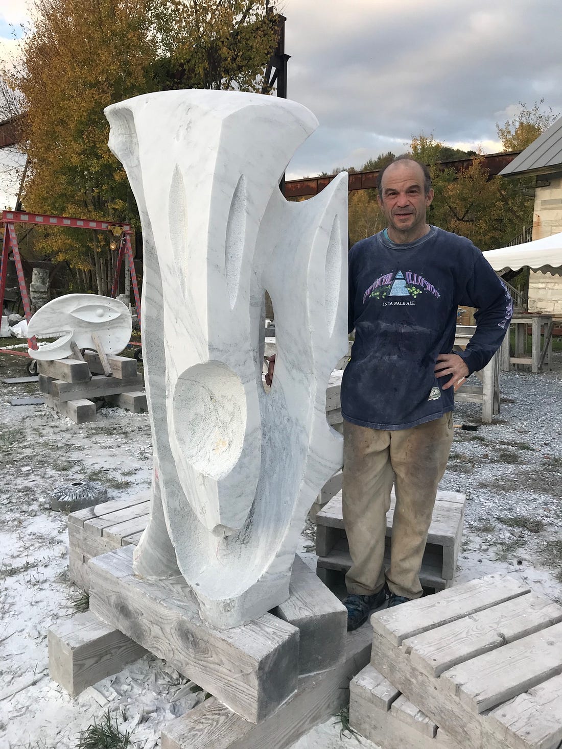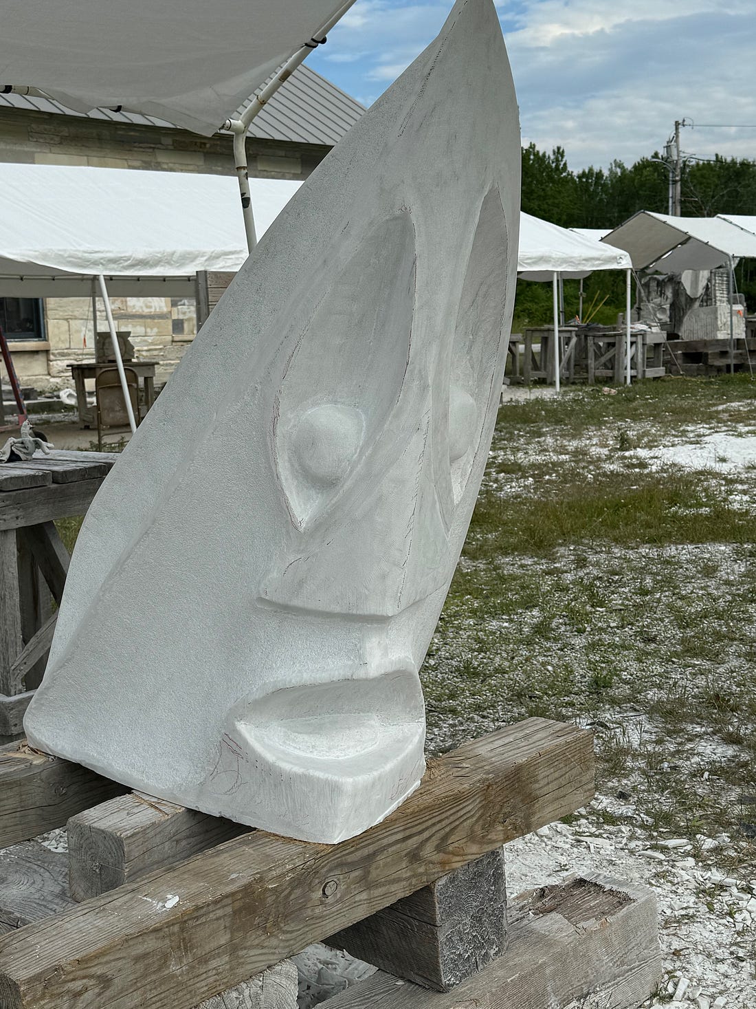 I like to work large; the stones are generally 1500-4500 lbs., so not easy to transport or display. I also do small pieces. My last one-man show in NYC pre-covid was all wood pieces and was attended by many Wheatley Class of 1974 graduates. All of the larger stone work is done at the Carving Studio and Sculpture Center in West Rutland, VT, where I am a long time member. They give classes for those interested in exploring stone. My home studio is where I do all of my wood pieces, generally 300-500 lbs., and stone pieces under 1500 lbs.