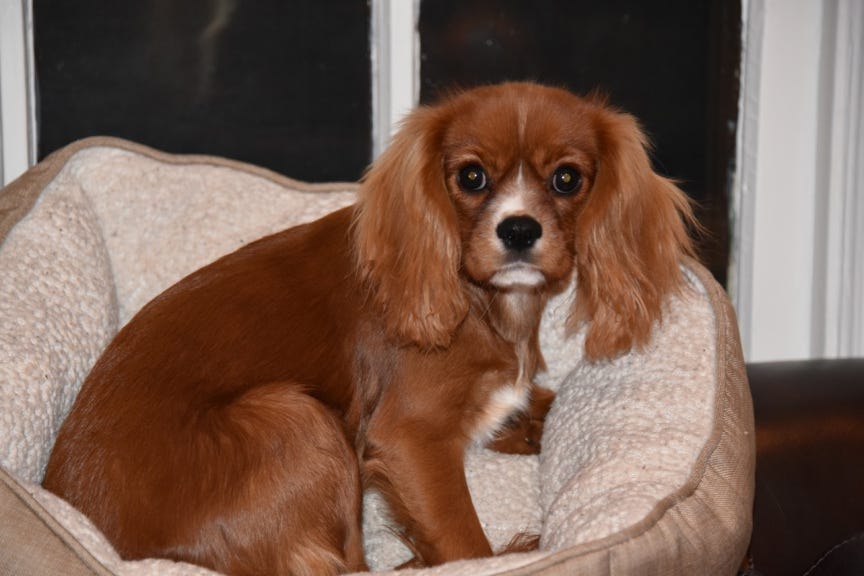 (1967) Ruby Cavalier King Charles Spaniel Molly as a puppy, staring out from