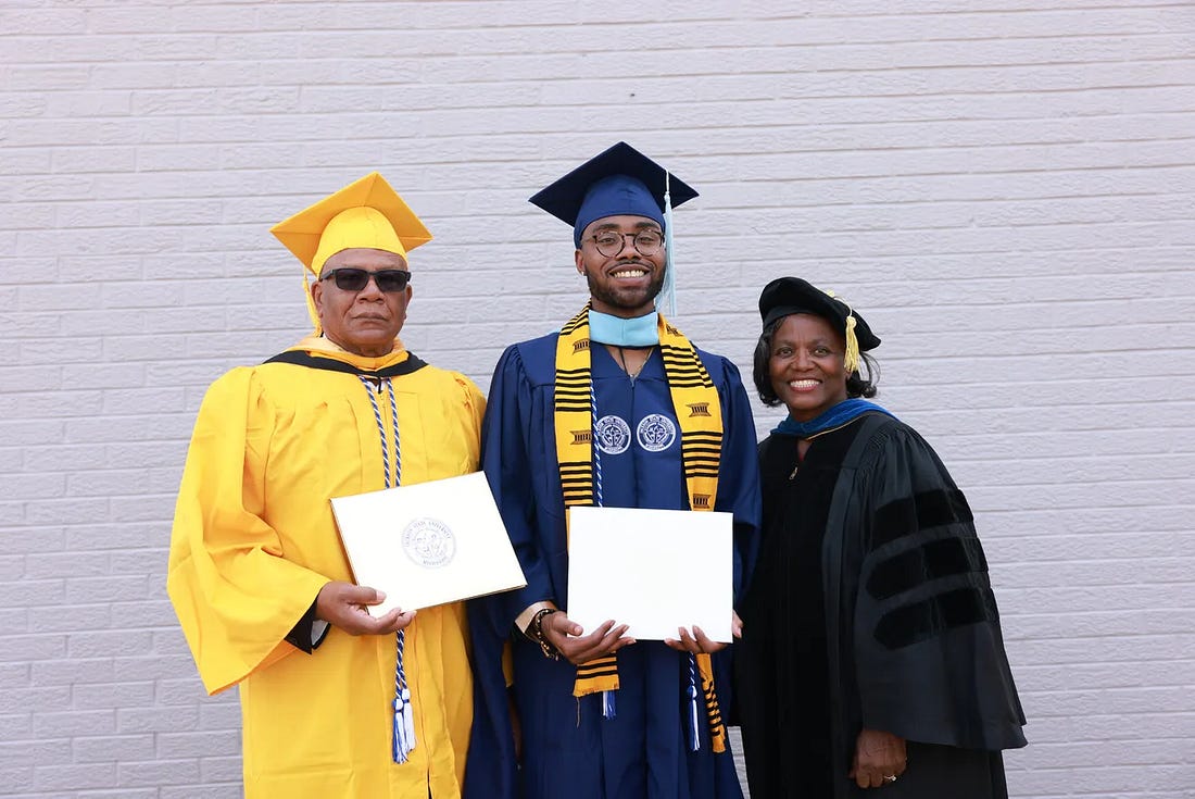 Jackson State University Professor Pamela Banks at the spring, 2022 JSU Commencement Ceremony in Jackson, Mississippi with her second cousin Symeon Butler (who received a Master’s Degree) and her first cousin, Donnie Banyard (left) who received a Golden Diploma marking the 50th Anniversary of his graduation.